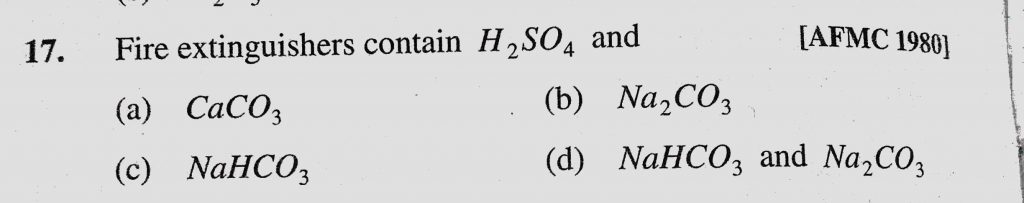 Fire extinguishers contain H2SO4 and (a) CaCO3 (b) Na2CO3 (c) NaHCO3 Fire extinguishers contain H2SO4 and (a) CaCO3 (b) Na2CO3 (c) NaHCO3 November 25, 2020 Category: Uncategorised (JEE Advanced Physics by BM Sharma + GMP Solutions) , Facebook Messenger WhatsApp Share this:TwitterFacebook Related