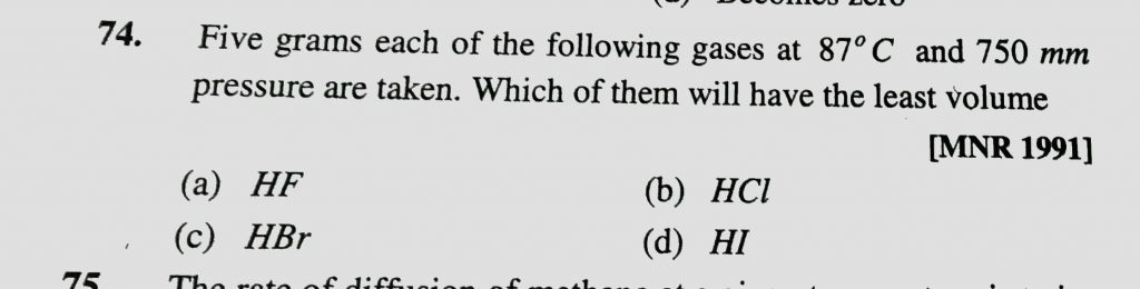 Five grams each of the following gases at 87 degree C and 750 mm pressure are taken. which of them will have the least volume (a) HF (b) HCL (c) HBr (d) HI Five grams each of the following gases at 87 degree C and 750 mm pressure are taken. which of them will have the least volume (a) HF (b) HCL (c) HBr (d) HI February 11, 2021 Category: Uncategorised (JEE Advanced Physics by BM Sharma + GMP Solutions) , Facebook Messenger WhatsApp Share this:TwitterFacebook Related