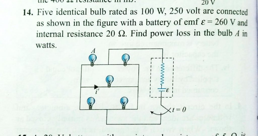 Five identical bulb rated as 100 W, 250 volt are connected as shown in the figure with a battery of emf e = 260 V and internal resistance 20 ohm . Find power loss in the bulb A in watts. 250 volt are connected as shown in the figure with a battery of emf e = 260 V and internal resistance 20 ohm . Find power loss in the bulb A in watts. Five identical bulb rated as 100 W November 18, 2020 Category: Uncategorised (JEE Advanced Physics by BM Sharma + GMP Solutions) , Facebook Messenger WhatsApp Share this:TwitterFacebook Related