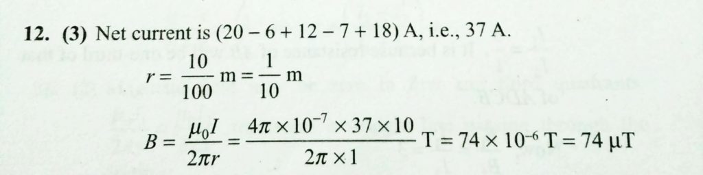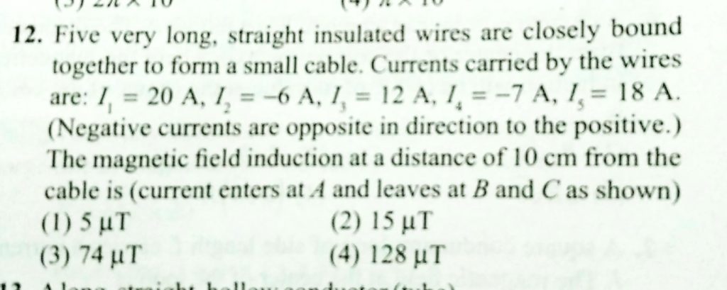 Five very long, straight insulated wires are closely bound together to form a small cable. Currents carried by the wires are: I1=20A,I2=−6A,I3=12A,I4=−7A,I5=18A. (Negative currents are opposite in direction to the positve.) The magnetic field induction at a distance of 10cm from the cable is (current enters at A and leaves at B and C as shown)