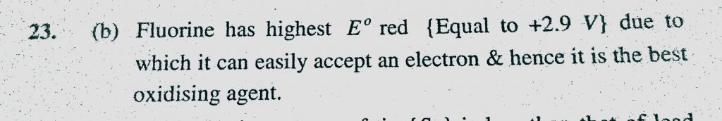 Flourine is the best oxidising agent because it has (a) Highest electron affinity (b) Highest E red (c) Highest E oxid (d) Lowest electron affinity Flourine is the best oxidising agent because it has (a) Highest electron affinity (b) Highest E red (c) Highest E oxid (d) Lowest electron affinity November 9, 2020 Category: Uncategorised (JEE Advanced Physics by BM Sharma + GMP Solutions) , Facebook Messenger WhatsApp Share this:TwitterFacebook Related