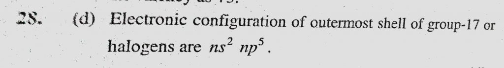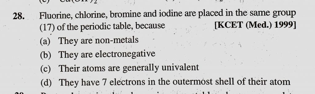 Fluorine, chlorine, bromine and iodine are placed in the same group (17) of the periodic table, because (a) They are non-metals (b) They are electronegative because (a) They are non-metals (b) They are electronegative bromine and iodine are placed in the same group (17) of the periodic table chlorine Fluorine November 10, 2020 Category: Uncategorised (JEE Advanced Physics by BM Sharma + GMP Solutions) , Facebook Messenger WhatsApp Share this:TwitterFacebook Related