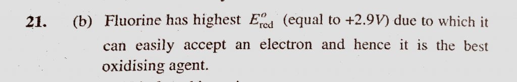 Fluorine is the best oxidising agent because it has (a) High electron affinity (b) Highest E red (c) Highest E oxid (d) Lowest electron affinity Fluorine is the best oxidising agent because it has (a) High electron affinity (b) Highest E red (c) Highest E oxid (d) Lowest electron affinity November 10, 2020 Category: Uncategorised (JEE Advanced Physics by BM Sharma + GMP Solutions) , Facebook Messenger WhatsApp Share this:TwitterFacebook Related