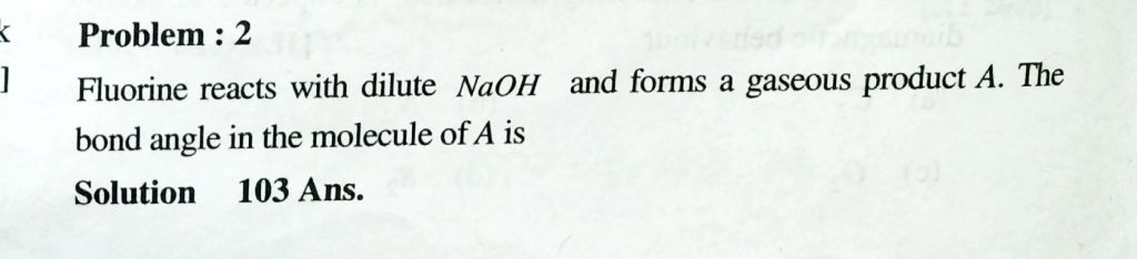 Fluorine reacts with dilute NaOH and forms a gaseous product A . The bond angle in the molecule of A is Fluorine reacts with dilute NaOH and forms a gaseous product A . The bond angle in the molecule of A is December 10, 2020 Category: Uncategorised (JEE Advanced Physics by BM Sharma + GMP Solutions) , Facebook Messenger WhatsApp Share this:TwitterFacebook Related