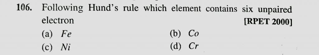 Following Hund’s rule which element contains six unpaired electron (a) Fe (b) Co (c) Ni (d) Cr Following Hund's rule which element contains six unpaired electron (a) Fe (b) Co (c) Ni (d) Cr November 29, 2020 Category: Uncategorised (JEE Advanced Physics by BM Sharma + GMP Solutions) , Facebook Messenger WhatsApp Share this:TwitterFacebook Related