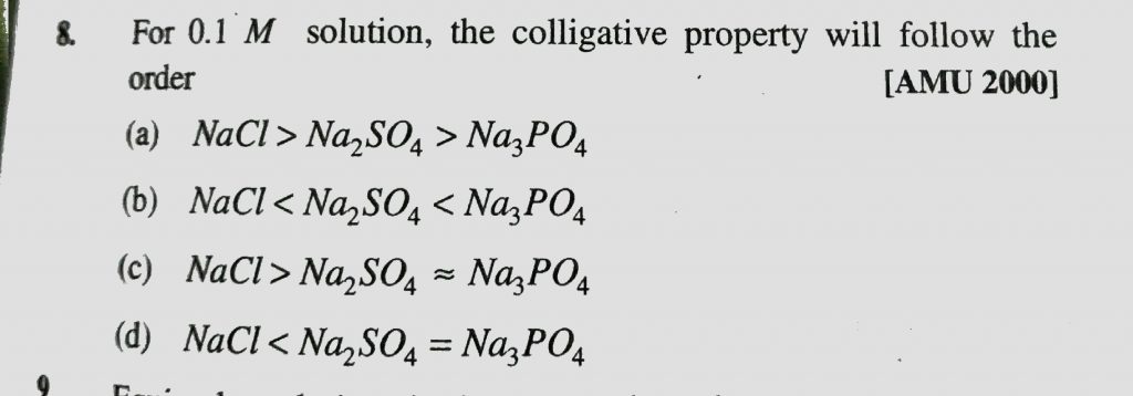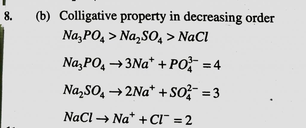 For 0.1 M solution , the colligative property will follow the order (a) NaCL > Na2SO4 > Na3PO4 (b) NaCL < Na2SO4 < Na3PO4 For 0.1 M solution the colligative property will follow the order (a) NaCL > Na2SO4 > Na3PO4 (b) NaCL < Na2SO4 < Na3PO4 December 12, 2020 Category: Uncategorised (JEE Advanced Physics by BM Sharma + GMP Solutions) , Facebook Messenger WhatsApp Share this:TwitterFacebook Related