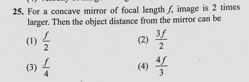 For a concave mirror of focal length f, image is 2 times larger. Then the object distance from the mirror can be For a concave mirror of focal length f image is 2 times larger. Then the object distance from the mirror can be October 7, 2020 Category: Uncategorised (JEE Advanced Physics by BM Sharma + GMP Solutions) , Facebook Messenger WhatsApp Share this:TwitterFacebook Related