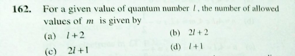 For a given value of quantum number l , the number of allowed values of m is given by For a given value of quantum number l the number of allowed values of m is given by November 29, 2020 Category: Uncategorised (JEE Advanced Physics by BM Sharma + GMP Solutions) , Facebook Messenger WhatsApp Share this:TwitterFacebook Related