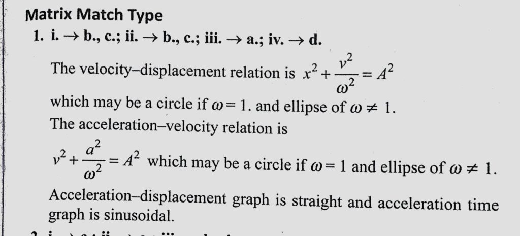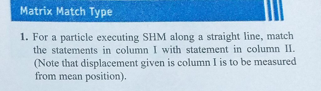 For a particle executing SHM along a straight line, match the statements in column 1 with statement in column 2. (Note that displacement given in column 1 is to be measured from mean position). For a particle executing SHM along a straight line match the statements in column 1 with statement in column 2. (Note that displacement given in column 1 is to be measured from mean position). October 31, 2020 Category: Uncategorised (JEE Advanced Physics by BM Sharma + GMP Solutions) , Facebook Messenger WhatsApp Share this:TwitterFacebook Related