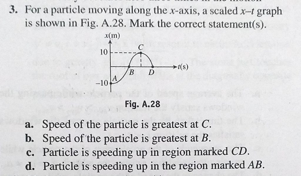 For a particle moving along the x-axis, a scaled x-t graph is shown in Fig.A.28. Mark the correct statement(s). a. Speed of the particle is greatest at C. b. Speed of the particle is greatest at B. a scaled x-t graph is shown in Fig.A.28. Mark the correct statement(s). a. Speed of the particle is greatest at C. b. Speed of the particle is greatest at B. For a particle moving along the x-axis September 24, 2020 Category: Uncategorised (JEE Advanced Physics by BM Sharma + GMP Solutions) , Facebook Messenger WhatsApp Share this:TwitterFacebook Related