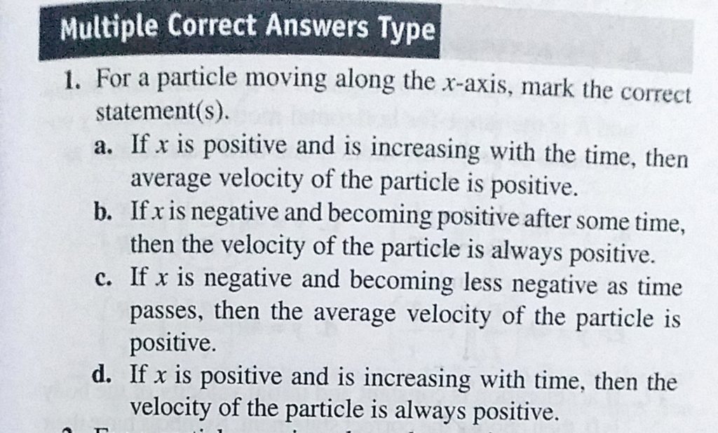For a particle moving along the x-axis, mark the correct statement(s). a. If x is positive and is increasing with the time, then average velocity of the particle is positive. If x is negative and becoming positive For a particle moving along the x-axis mark the correct statement(s). a. If x is positive and is increasing with the time then average velocity of the particle is positive. If x is negative and becoming positive September 24, 2020 Category: Uncategorised (JEE Advanced Physics by BM Sharma + GMP Solutions) , Facebook Messenger WhatsApp Share this:TwitterFacebook Related
