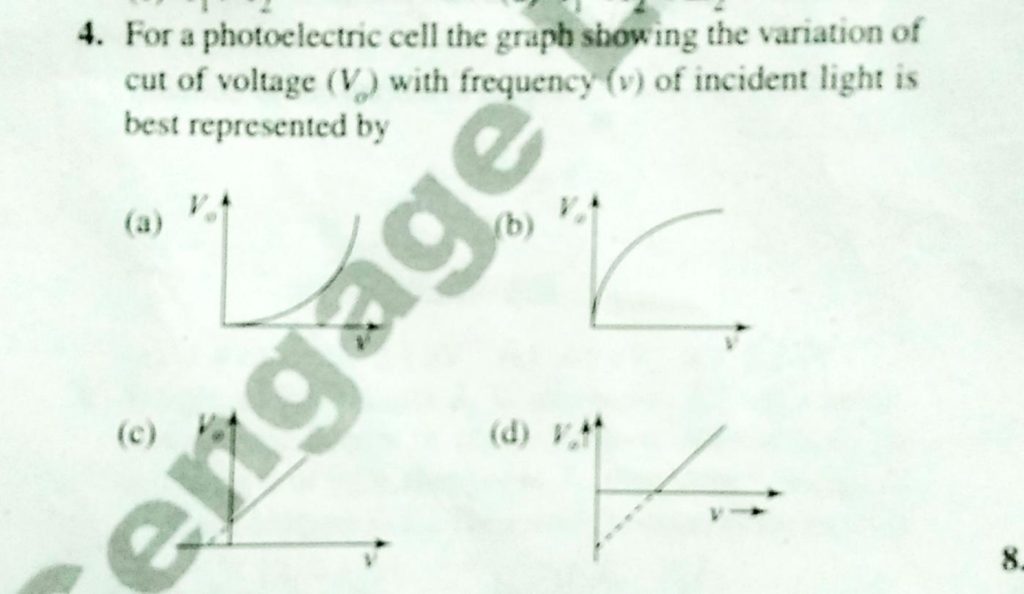 For a photoelectric cell the graph showing the variation of cut of voltage (Vo) with frequency (v) of incident light is best represented by For a photoelectric cell the graph showing the variation of cut of voltage (Vo) with frequency (v) of incident light is best represented by September 13, 2020 Category: Uncategorised (JEE Advanced Physics by BM Sharma + GMP Solutions) , Facebook Messenger WhatsApp Share this:TwitterFacebook Related