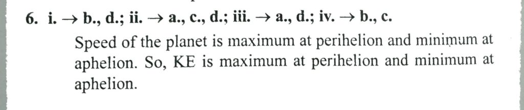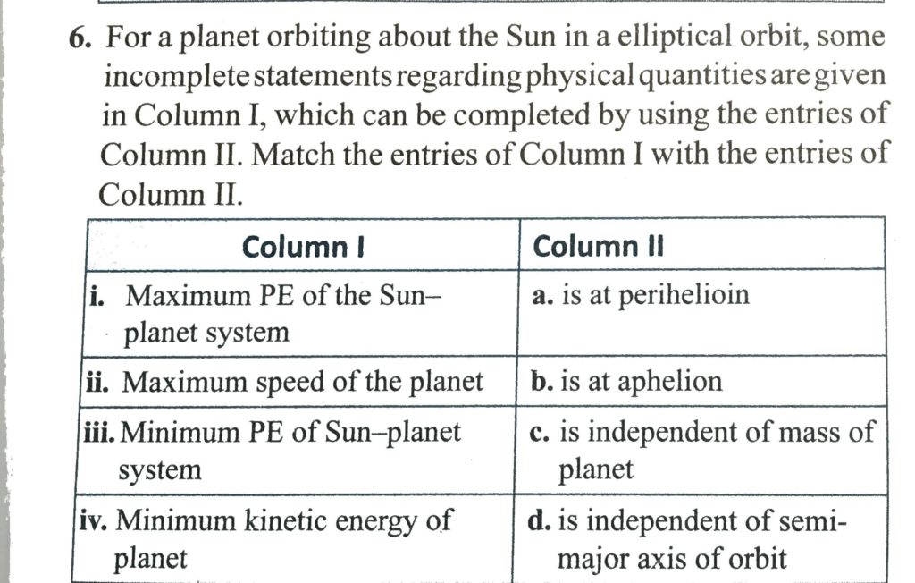 For a planet orbiting about the Sun in a elliptical orbit, some incomplete statements regarding physical quantities are given in Column I, which can be completed by using the entries of Column II. Match the entries of Column I with the entries of Column II.