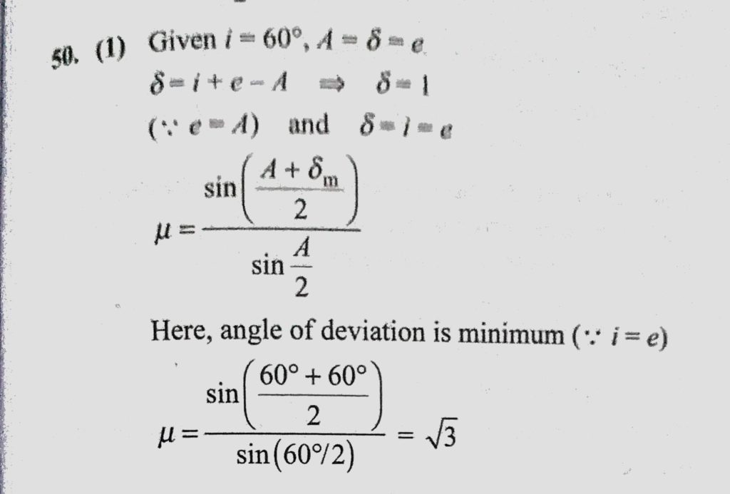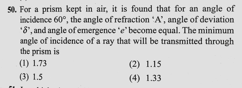 For a prism kept in air, it is found that for an angle of incidence 60, the angle of refraction A, angle of deviation delta, and angle of emergence e become equal. The minimum angle of incidence of a ray and angle of emergence e become equal. The minimum angle of incidence of a ray angle of deviation delta For a prism kept in air it is found that for an angle of incidence 60 the angle of refraction A October 6, 2020 Category: Uncategorised (JEE Advanced Physics by BM Sharma + GMP Solutions) , Facebook Messenger WhatsApp Share this:TwitterFacebook Related