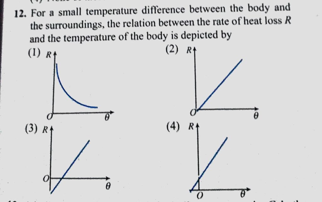 For a small temperature difference between the body and the surroundings, the relation between the rate of heat loss R and the temperature of the body is depicted by For a small temperature difference between the body and the surroundings the relation between the rate of heat loss R and the temperature of the body is depicted by October 25, 2020 Category: Uncategorised (JEE Advanced Physics by BM Sharma + GMP Solutions) , Facebook Messenger WhatsApp Share this:TwitterFacebook Related