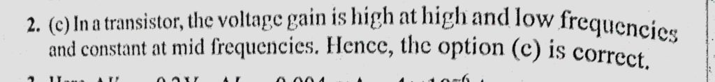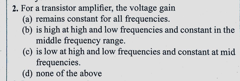 For a transistor amplifier, the voltage gain (a) remains constant for all frequencies. (b) is high at high and low frequencies and constant in the middle frequency range. For a transistor amplifier the voltage gain (a) remains constant for all frequencies. (b) is high at high and low frequencies and constant in the middle frequency range. October 21, 2020 Category: Uncategorised (JEE Advanced Physics by BM Sharma + GMP Solutions) , Facebook Messenger WhatsApp Share this:TwitterFacebook Related