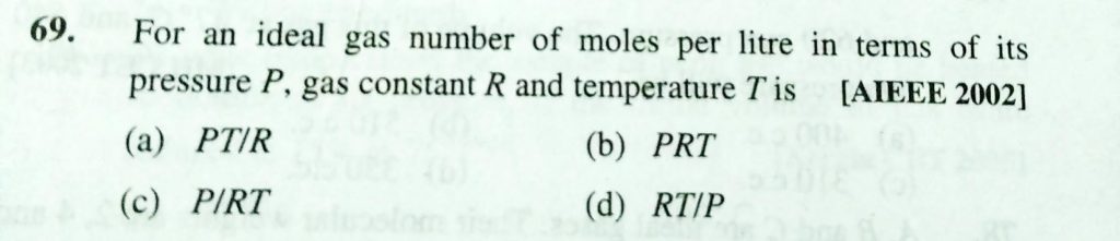 For an ideal gas number of moles per litre in terms of its pressure P, gas constant R and temperature T is For an ideal gas number of moles per litre in terms of its pressure P gas constant R and temperature T is February 11, 2021 Category: Uncategorised (JEE Advanced Physics by BM Sharma + GMP Solutions) , Facebook Messenger WhatsApp Share this:TwitterFacebook Related
