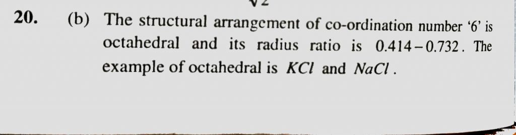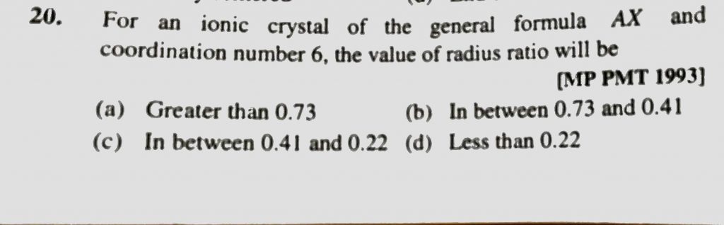 For an ionic crystal of the general formula AX and coordination number 6, the value of radius ratio will be For an ionic crystal of the general formula AX and coordination number 6 the value of radius ratio will be December 16, 2020 Category: Uncategorised (JEE Advanced Physics by BM Sharma + GMP Solutions) , Facebook Messenger WhatsApp Share this:TwitterFacebook Related