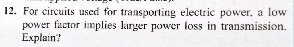 For circuits used for transporting electric power, a low power factor implies larger power loss in transmission. Explain ? a low power factor implies larger power loss in transmission. Explain ? For circuits used for transporting electric power October 27, 2020 Category: Uncategorised (JEE Advanced Physics by BM Sharma + GMP Solutions) , Facebook Messenger WhatsApp Share this:TwitterFacebook Related