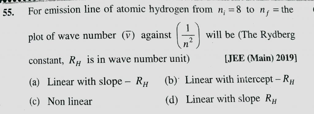 For emission line of atomic hydrogen from ni = 8 to nf = the plot of wave number (v ) against [1/n^2 ] will be ( the rydberg constant , Rh is in wave number unit ) For emission line of atomic hydrogen from ni = 8 to nf = the plot of wave number (v ) against [1/n^2 ] will be ( the rydberg constant Rh is in wave number unit ) November 30, 2020 Category: Uncategorised (JEE Advanced Physics by BM Sharma + GMP Solutions) , Facebook Messenger WhatsApp Share this:TwitterFacebook Related
