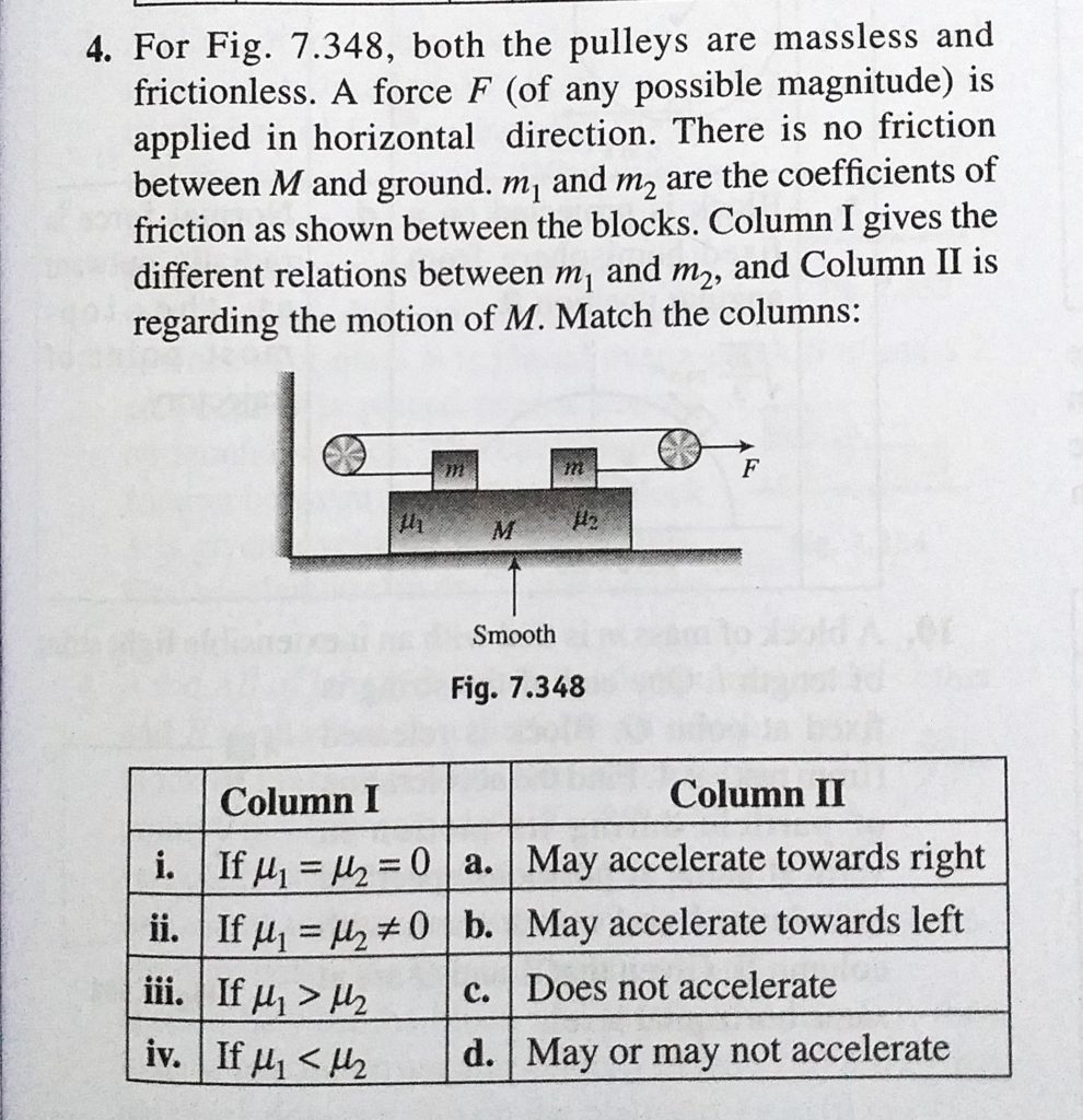 For Fig. 7.348, both the pulleys are massless and frictionless. A force F (of any possible magnitude ) is applied in horizontal direction. There is no friction between M and ground. both the pulleys are massless and frictionless. A force F (of any possible magnitude ) is applied in horizontal direction. There is no friction between M and ground. For Fig. 7.348 October 2, 2020 Category: Uncategorised (JEE Advanced Physics by BM Sharma + GMP Solutions) , Facebook Messenger WhatsApp Share this:TwitterFacebook Related