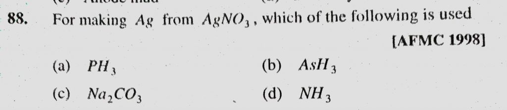 For making Ag from AgNO3, which of the following is used (a) PH3 (b) AsH3 (c) Na2CO3 (d) NH3 For making Ag from AgNO3 which of the following is used (a) PH3 (b) AsH3 (c) Na2CO3 (d) NH3 December 1, 2020 Category: Uncategorised (JEE Advanced Physics by BM Sharma + GMP Solutions) , Facebook Messenger WhatsApp Share this:TwitterFacebook Related