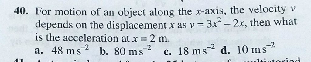 For motion of an object along the x-axis, the velocity v depends on the displacement x as v = 3x^2 – 2x, then what is the acceleration at x = 2 m. For motion of an object along the x-axis the velocity v depends on the displacement x as v = 3x^2 - 2x then what is the acceleration at x = 2 m. September 19, 2020 Category: Uncategorised (JEE Advanced Physics by BM Sharma + GMP Solutions) , Facebook Messenger WhatsApp Share this:TwitterFacebook Related
