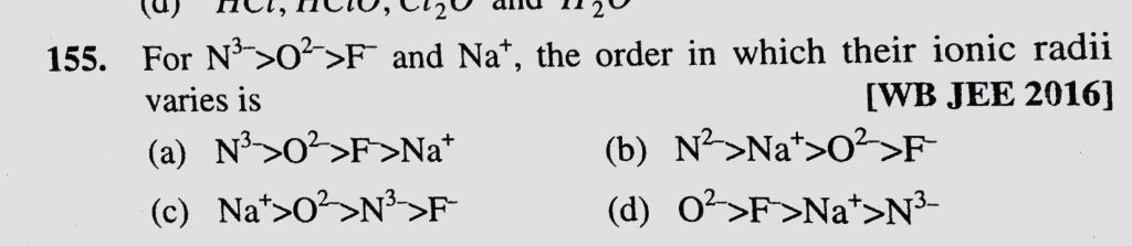 For N3- > O2- > F- and Na+, the order in which their ionic radii varies is For N3- > O2- > F- and Na+ the order in which their ionic radii varies is November 25, 2020 Category: Uncategorised (JEE Advanced Physics by BM Sharma + GMP Solutions) , Facebook Messenger WhatsApp Share this:TwitterFacebook Related