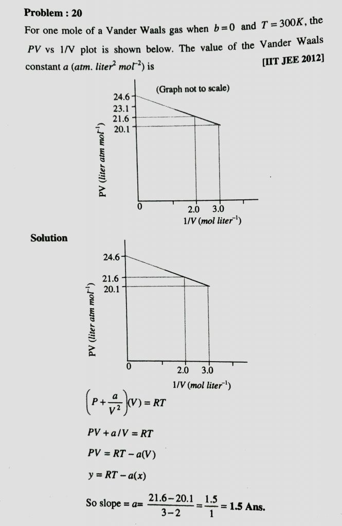 For one mole of a vander Waal’s gas when b = 0 and T = 300 K, the PV vs 1/V plot is shown below. The value of the Vander Waals constant a (atm . litre^2/mol^2 ) is For one mole of a vander Waal's gas when b = 0 and T = 300 K the PV vs 1/V plot is shown below. The value of the Vander Waals constant a (atm . litre^2/mol^2 ) is February 12, 2021 Category: Uncategorised (JEE Advanced Physics by BM Sharma + GMP Solutions) , Facebook Messenger WhatsApp Share this:TwitterFacebook Related