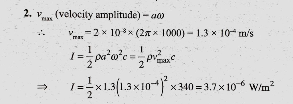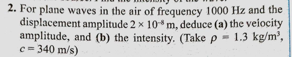 For plane waves in the air of frequency 1000 Hz and the displacement amplitude 2 * 10^-8 m, deduce (a) the velocity amplitude, and (b) the intensity. and (b) the intensity. deduce (a) the velocity amplitude For plane waves in the air of frequency 1000 Hz and the displacement amplitude 2 * 10^-8 m November 1, 2020 Category: Uncategorised (JEE Advanced Physics by BM Sharma + GMP Solutions) , Facebook Messenger WhatsApp Share this:TwitterFacebook Related