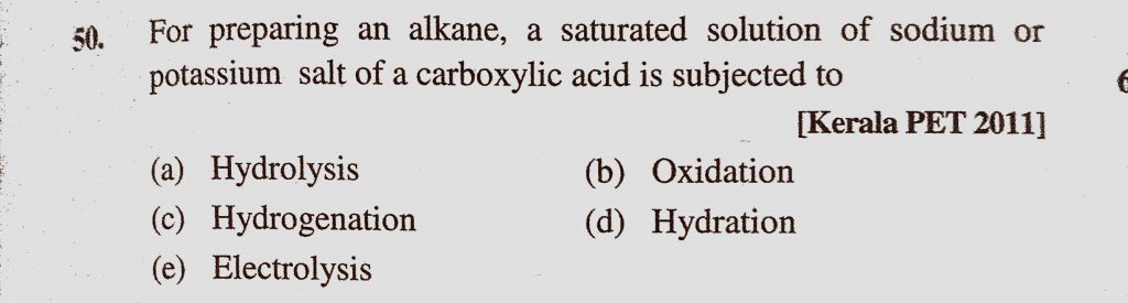 For preparing an alkane, a saturated solution of sodium or potassium salt of a carboxylic acid is subjected to (a) Hydrolysis (b) Oxidation (c) Hydrogenation a saturated solution of sodium or potassium salt of a carboxylic acid is subjected to (a) Hydrolysis (b) Oxidation (c) Hydrogenation For preparing an alkane December 12, 2020 Category: Uncategorised (JEE Advanced Physics by BM Sharma + GMP Solutions) , Facebook Messenger WhatsApp Share this:TwitterFacebook Related