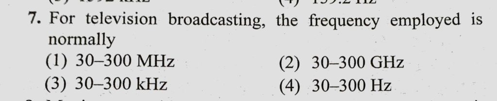 For television broadcasting, the frequency employed is normally (1) 30-300 MHz (2) 30-300 GHz For television broadcasting the frequency employed is normally (1) 30-300 MHz (2) 30-300 GHz October 22, 2020 Category: Uncategorised (JEE Advanced Physics by BM Sharma + GMP Solutions) , Facebook Messenger WhatsApp Share this:TwitterFacebook Related