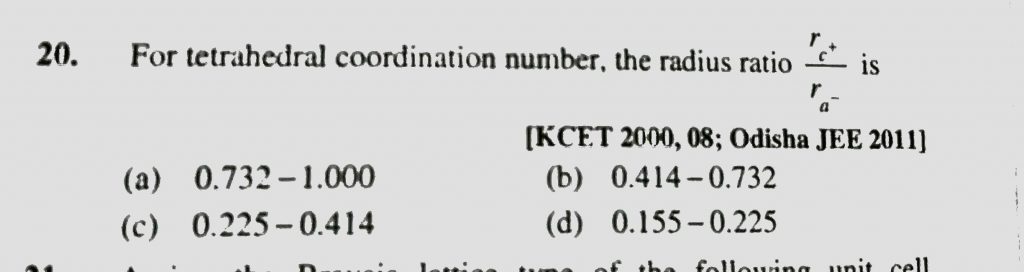 For tetrahedral coordination number , the radius ratio rc^+ /ra^- is (a) 0.732 – 1.000 (b) 0.414 – 0.732 (c) 0.225 – 0.414 (d) 0.155 – 0.225 For tetrahedral coordination number the radius ratio rc^+ /ra^- is (a) 0.732 - 1.000 (b) 0.414 - 0.732 (c) 0.225 - 0.414 (d) 0.155 - 0.225 February 8, 2021 Category: Uncategorised (JEE Advanced Physics by BM Sharma + GMP Solutions) , Facebook Messenger WhatsApp Share this:TwitterFacebook Related