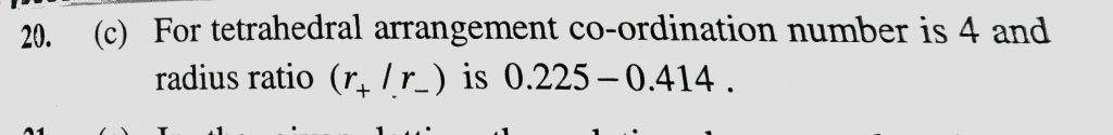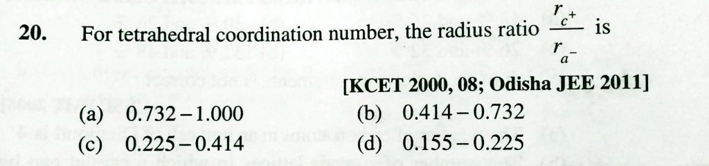For tetrahedral coorination number, the radius ratio rc+ / ra^- is For tetrahedral coorination number the radius ratio rc+ / ra^- is December 16, 2020 Category: Uncategorised (JEE Advanced Physics by BM Sharma + GMP Solutions) , Facebook Messenger WhatsApp Share this:TwitterFacebook Related