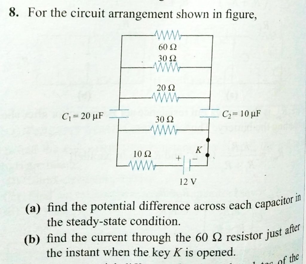 For the circuit arrangement shown in figure, (a) Find the potential difference across each capacitor in the steady – state condition. (b) find the current throgh the 60 ohm resistor just after the instant when the key K is opened. (a) Find the potential difference across each capacitor in the steady - state condition. (b) find the current throgh the 60 ohm resistor just after the instant when the key K is opened. For the circuit arrangement shown in figure November 11, 2020 Category: Uncategorised (JEE Advanced Physics by BM Sharma + GMP Solutions) , Facebook Messenger WhatsApp Share this:TwitterFacebook Related