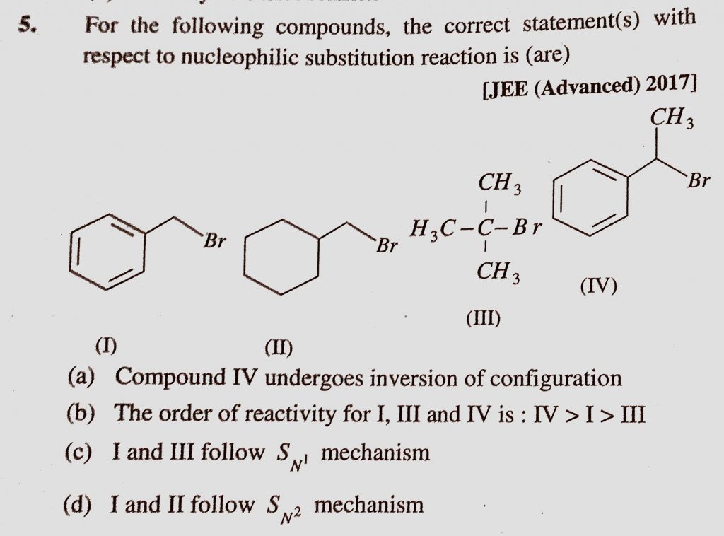 For the following compounds, the correct statement(s) with respect to nucleophilic substitution reaction is (are) (a) Compound IV undergoes inversion of configuration (b) The order of reactivity for I, III and IV For the following compounds III and IV the correct statement(s) with respect to nucleophilic substitution reaction is (are) (a) Compound IV undergoes inversion of configuration (b) The order of reactivity for I February 9, 2021 Category: Uncategorised (JEE Advanced Physics by BM Sharma + GMP Solutions) , Facebook Messenger WhatsApp Share this:TwitterFacebook Related