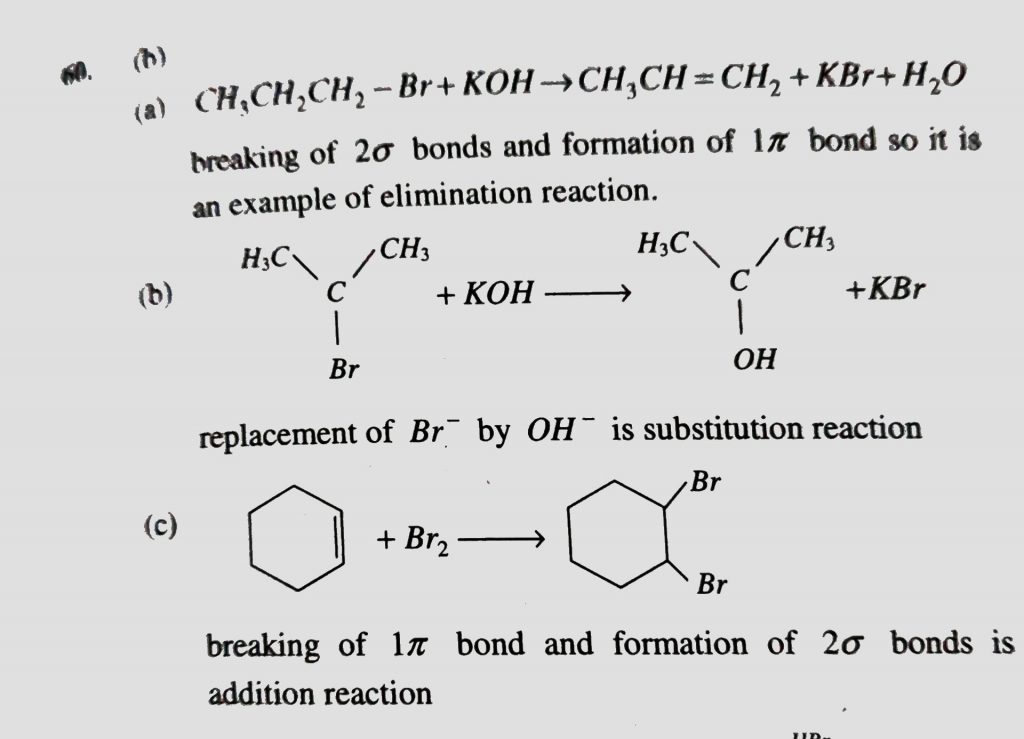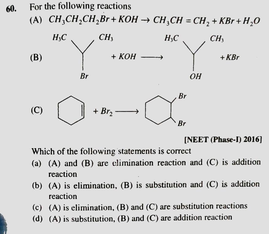 For the following reactions (A) CH3CH2CH2Br + KOH to CH3CH = CH2 + KBr + H2O (B) (C) Which of the following statements is correct (a) (A) and (B) are elimination reaction and (C) is addition reaction For the following reactions (A) CH3CH2CH2Br + KOH to CH3CH = CH2 + KBr + H2O (B) (C) Which of the following statements is correct (a) (A) and (B) are elimination reaction and (C) is addition reaction December 13, 2020 Category: Uncategorised (JEE Advanced Physics by BM Sharma + GMP Solutions) , Facebook Messenger WhatsApp Share this:TwitterFacebook Related