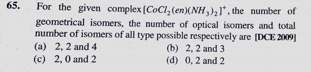 For the given complex (CoCl2(en)(NH3)2)+, the number of geometrical isomers, the number of optical isomers and total number of isomers of all type possible respectively are For the given complex (CoCl2(en)(NH3)2)+ the number of geometrical isomers the number of optical isomers and total number of isomers of all type possible respectively are December 4, 2020 Category: Uncategorised (JEE Advanced Physics by BM Sharma + GMP Solutions) , Facebook Messenger WhatsApp Share this:TwitterFacebook Related