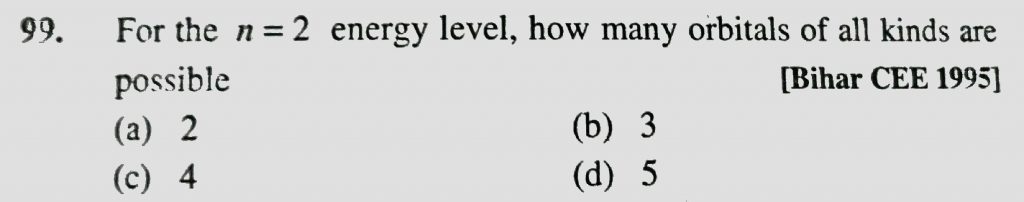 For the n = 2 energy level , how many orbitals of all kinds are possible (a) 2 (b) 3 (c) 4 (d) 5 For the n = 2 energy level how many orbitals of all kinds are possible (a) 2 (b) 3 (c) 4 (d) 5 November 29, 2020 Category: Uncategorised (JEE Advanced Physics by BM Sharma + GMP Solutions) , Facebook Messenger WhatsApp Share this:TwitterFacebook Related