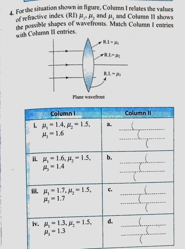 For the situation shown in figure. Column 1 relates the values of refractive index ( RI ) mu 1 , mu 2, and mu 3 and Column 2 shown the possible shapes of wavefronts. Match column and mu 3 and Column 2 shown the possible shapes of wavefronts. Match column For the situation shown in figure. Column 1 relates the values of refractive index ( RI ) mu 1 mu 2 October 11, 2020 Category: Uncategorised (JEE Advanced Physics by BM Sharma + GMP Solutions) , Facebook Messenger WhatsApp Share this:TwitterFacebook Related