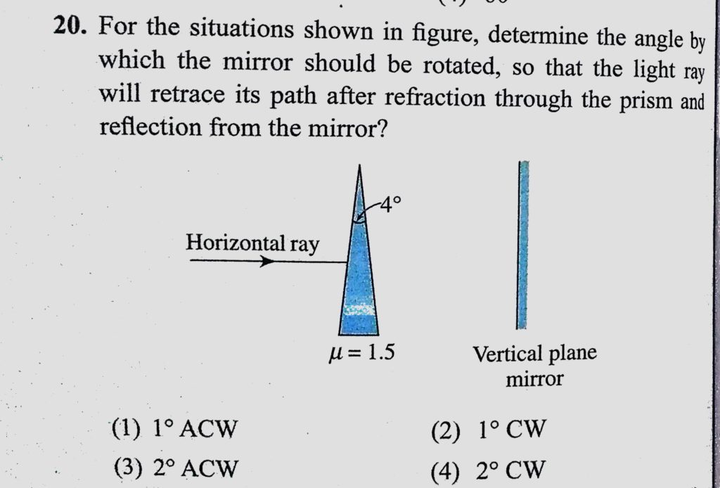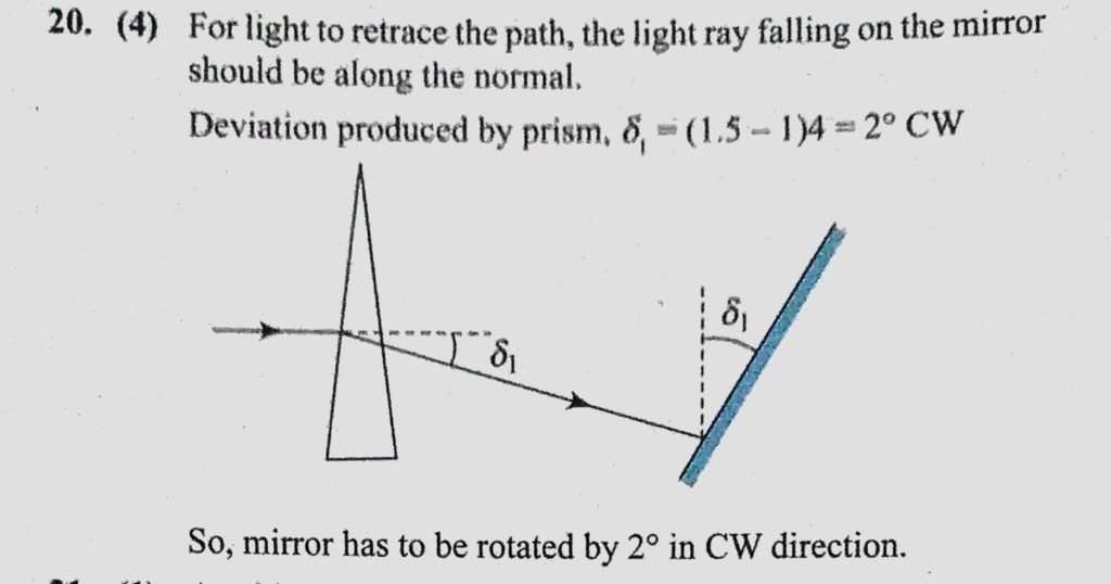 For the situations shown in figure, determine the angle by which the mirror should be rotated, so that the light ray will retrace its path after refraction through the prism and reflection determine the angle by which the mirror should be rotated For the situations shown in figure so that the light ray will retrace its path after refraction through the prism and reflection October 6, 2020 Category: Uncategorised (JEE Advanced Physics by BM Sharma + GMP Solutions) , Facebook Messenger WhatsApp Share this:TwitterFacebook Related