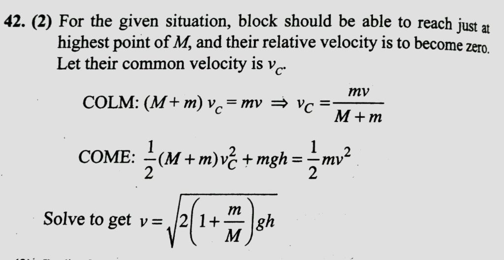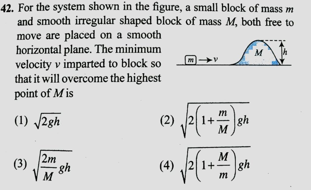 For the system shown in the figure, a small block of mass m and smooth irregular shaped block of mass M, both free to move are placed on a smooth horizontal plane. The minimum velocity v imparted to block so that it will overcome the highest point of M is