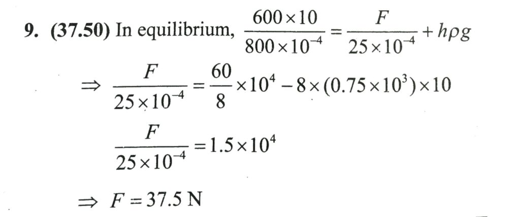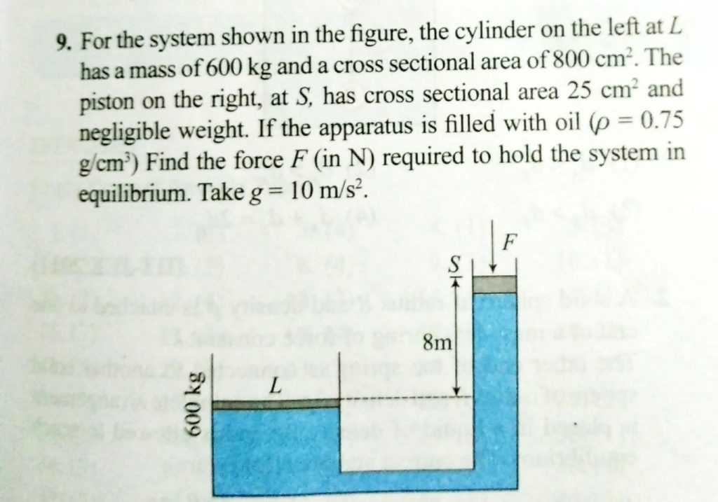 For the system shown in the figure, the cylinder on the left at L has a mass of 600 kg and a cross sectional area of 800 cm ^ 2 . The piston on the right, at S, has cross sectional area 25cm 2 and negligible weight. If the apparatus is filled with oil. (ρ=0.75 gm/cm ^3 ) Find the force F required to hold the system in equilibrium.