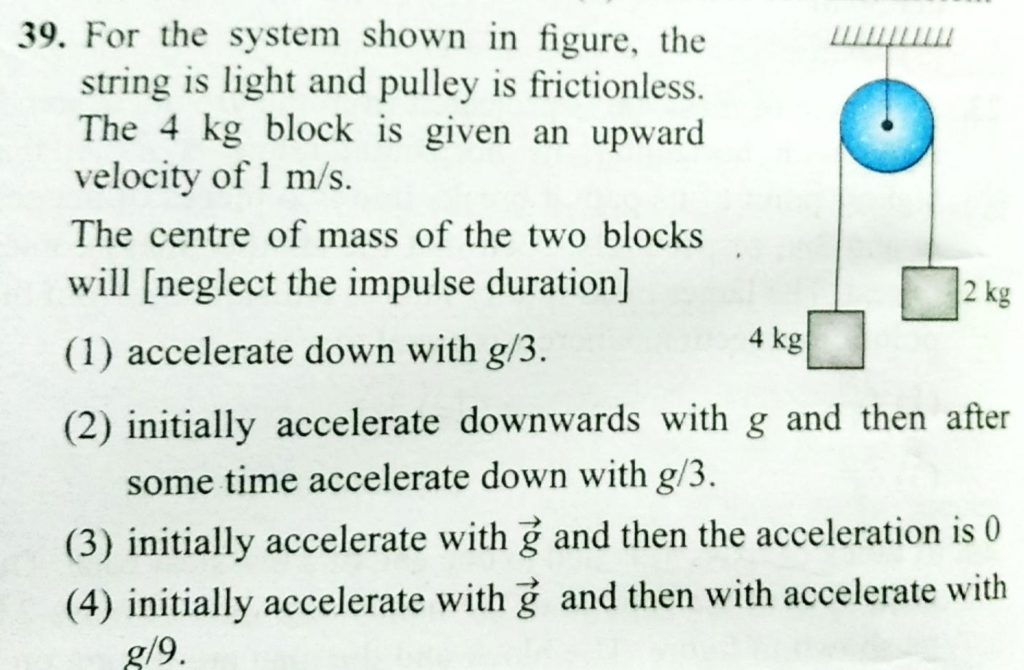 For the system shown in figure the string is light and pulley is frictionless . The 4 kg block is given an upward velocity of 1 m/s. The centre of mass of the two blocks will For the system shown in figure the string is light and pulley is frictionless . The 4 kg block is given an upward velocity of 1 m/s. The centre of mass of the two blocks will September 21, 2020 Category: Uncategorised (JEE Advanced Physics by BM Sharma + GMP Solutions) , Facebook Messenger WhatsApp Share this:TwitterFacebook Related