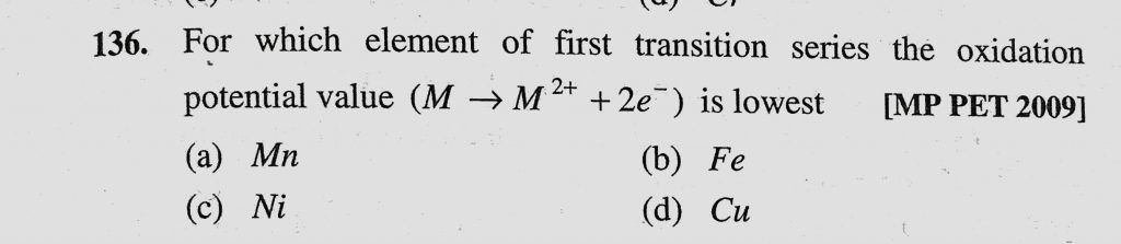For which element of first transition series the oxidation potential value (M to M2+ + 2e – is lowest (a) Mn (b) Fe (c) Ni (d) Cu For which element of first transition series the oxidation potential value (M to M2+ + 2e - is lowest (a) Mn (b) Fe (c) Ni (d) Cu November 30, 2020 Category: Uncategorised (JEE Advanced Physics by BM Sharma + GMP Solutions) , Facebook Messenger WhatsApp Share this:TwitterFacebook Related