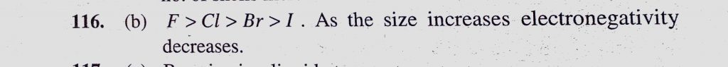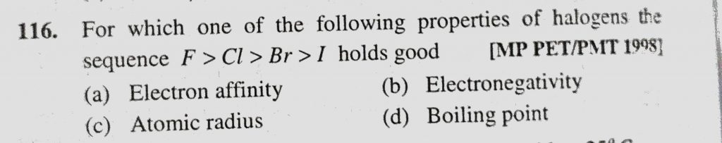 For which one of the following properties of halogens the sequence F > Cl > Br > I holds good (a) Electron affinity (b) Electronegativity (c) Atomic radius For which one of the following properties of halogens the sequence F > Cl > Br > I holds good (a) Electron affinity (b) Electronegativity (c) Atomic radius November 24, 2020 Category: Uncategorised (JEE Advanced Physics by BM Sharma + GMP Solutions) , Facebook Messenger WhatsApp Share this:TwitterFacebook Related