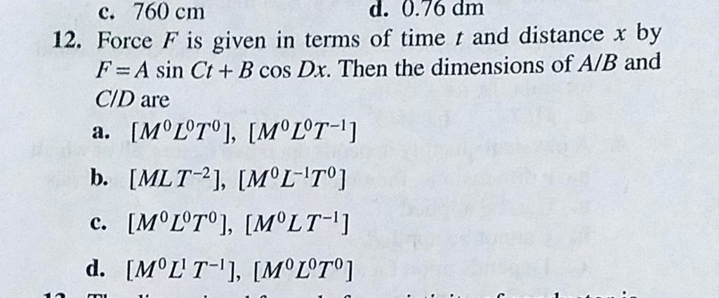 Force F is given in terms of time t and distance x by F = A sin Ct + B cos Dx. Then the dimensions of A/B and C/D are Force F is given in terms of time t and distance x by F = A sin Ct + B cos Dx. Then the dimensions of A/B and C/D are September 15, 2020 Category: Uncategorised (JEE Advanced Physics by BM Sharma + GMP Solutions) , Facebook Messenger WhatsApp Share this:TwitterFacebook Related