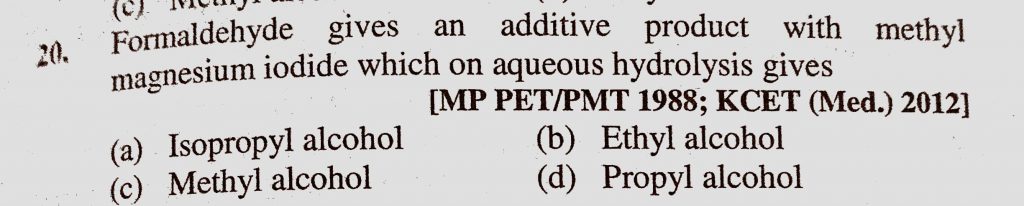 Formaldehyde gives an additive product with methyl magnesium iodide which on aqueous hydrolysis gives (a) Isopropyl alcohol (b) Ethyl alcohol (c) Methyl alcohol Formaldehyde gives an additive product with methyl magnesium iodide which on aqueous hydrolysis gives (a) Isopropyl alcohol (b) Ethyl alcohol (c) Methyl alcohol February 10, 2021 Category: Uncategorised (JEE Advanced Physics by BM Sharma + GMP Solutions) , Facebook Messenger WhatsApp Share this:TwitterFacebook Related