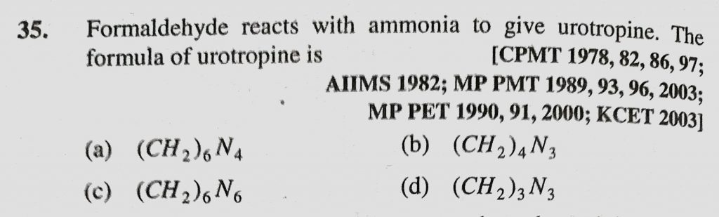 Formaldehyde reacts with ammonia to give urotropine. The formula of urotropine is (a) (CH2)6N4 (b) (CH2)4N3 (c) (CH2)6N6 (d) (CH2)3N3 Formaldehyde reacts with ammonia to give urotropine. The formula of urotropine is (a) (CH2)6N4 (b) (CH2)4N3 (c) (CH2)6N6 (d) (CH2)3N3 February 11, 2021 Category: Uncategorised (JEE Advanced Physics by BM Sharma + GMP Solutions) , Facebook Messenger WhatsApp Share this:TwitterFacebook Related