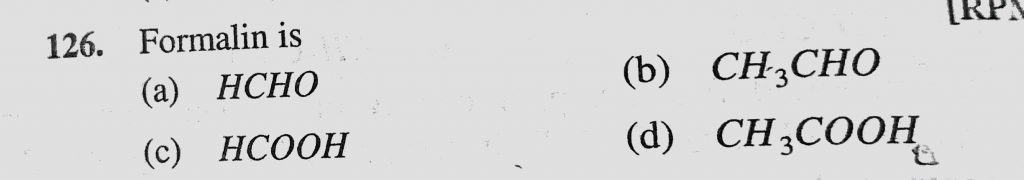 Formalin is (a) HCHO (b) CH3CHO (c) HCOOH (d) CH3COOH Formalin is (a) HCHO (b) CH3CHO (c) HCOOH (d) CH3COOH February 12, 2021 Category: Uncategorised (JEE Advanced Physics by BM Sharma + GMP Solutions) , Facebook Messenger WhatsApp Share this:TwitterFacebook Related